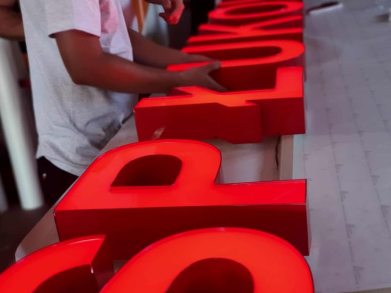 Dzięki soczewkom, które rozpraszają światło i oświetlają lico litery od tyłu, uzyskujemy efekt równomiernego podświetlenia. Boki liter wykonywane są z giętej maszynowo taśmy aluminiowej, która występuje w różnych kolorach. Istnieją różne rodzaje i wysokości taśmy aluminiowej. Najczęściej stosowane są te o wysokości 91 mm. Istnieją taśmy płaskie oraz z zagiętym bokiem, tzw. DF-ki. Te ostatnie dodatkowo dodają literom obrysu, czy inaczej mówiąc, rantu.